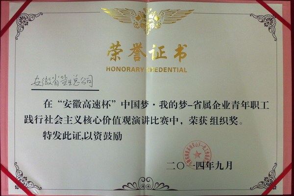 9月26日下午,由安徽省關(guān)心下一代工作委員會(huì )、安徽省國資系統關(guān)心下一代工作委員會(huì )主辦的“安徽高速杯”中國夢(mèng)·我的夢(mèng)——省屬企業(yè)青年職工踐行社會(huì )主義核心價(jià)值觀(guān)演講比賽決賽,在安徽省高速集團隆重舉行。省公司在此次比賽中榮獲集體組織獎,代表省公司參加比賽的廬江縣公司職工柯君憑借雄厚的實(shí)力和精彩的發(fā)揮榮獲個(gè)人一等獎。
