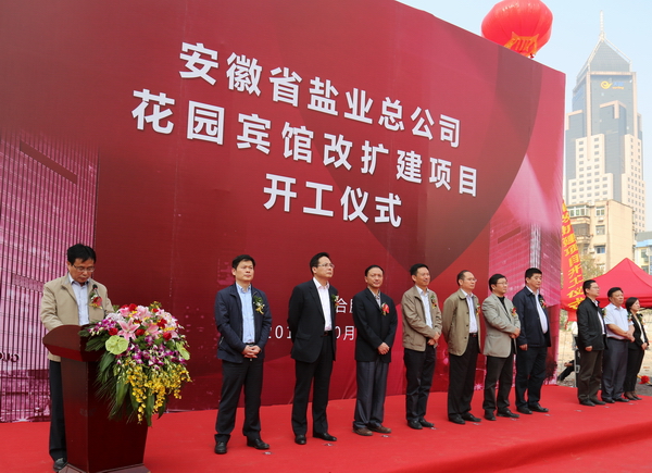 2014年10月18日上午,安徽省花園賓館改擴建項目在花園賓館舉行隆重的開(kāi)工奠基儀式,參加儀式的嘉賓有:中共廬陽(yáng)區委書(shū)記吳勁、副書(shū)記張家祥,廬陽(yáng)區副區長(cháng)李仲生、中建八局四公司董事長(cháng)周可璋及相關(guān)協(xié)作單位、省鹽業(yè)總公司總經(jīng)理詹先豪,副總經(jīng)理王良貴、顏宗華、楊曉彬,省公司本部機關(guān)處室及直屬公司主要負責人。